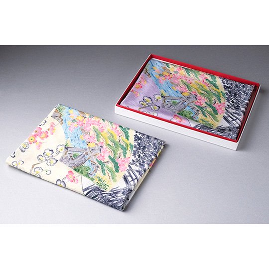 Kanazawa Castle and the beautiful Kenrokuen Garden lantern are drawn on the fan surface, and this furoshiki is surrounded by plum blossoms to celebrate spring.