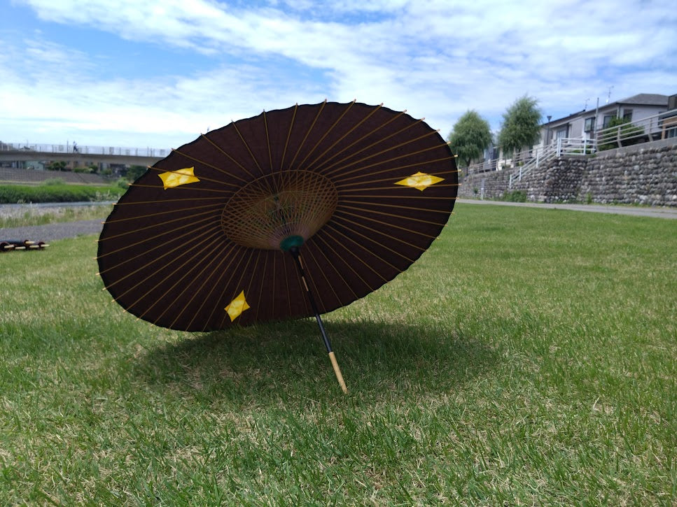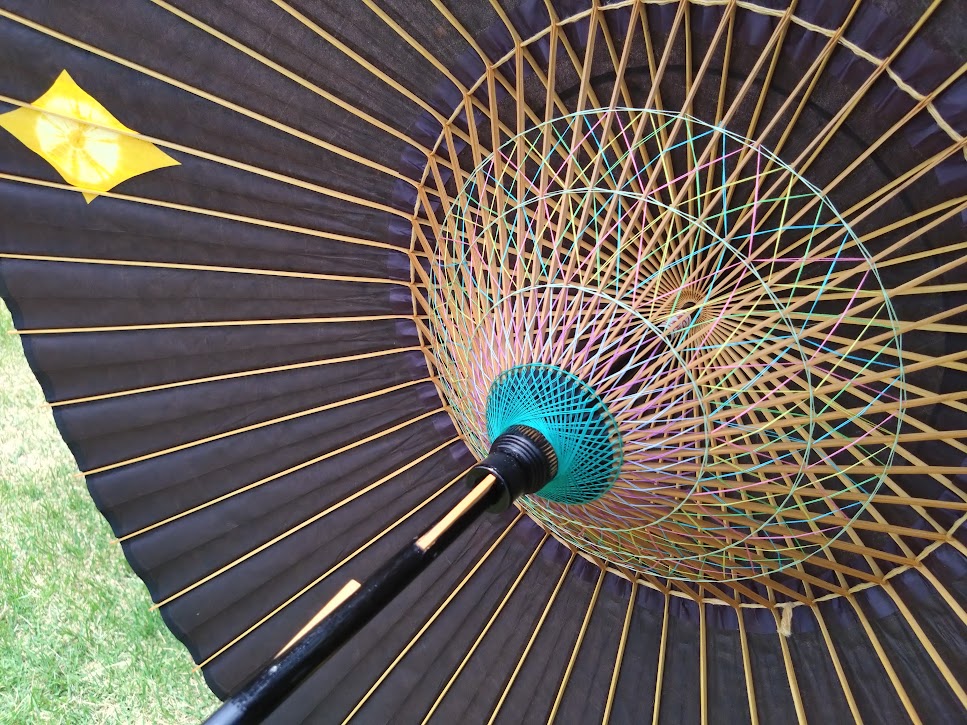 A custom-made umbrella with 48 ribs and two wooden halves. A black umbrella with yellow tie-dye accents on three sides.