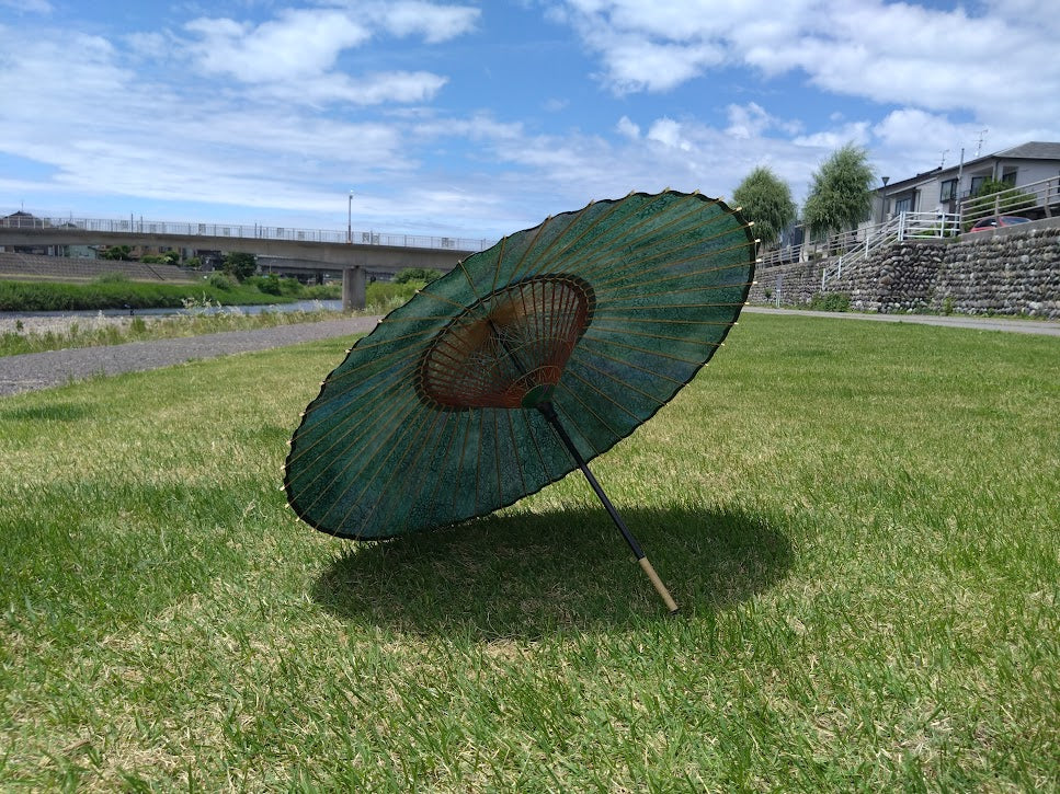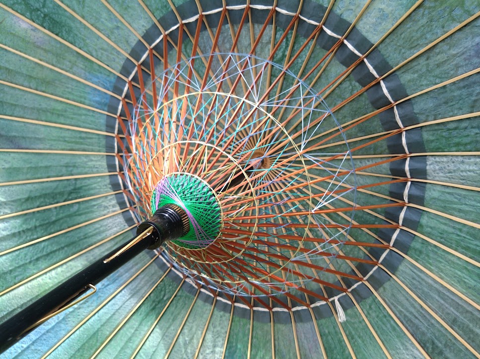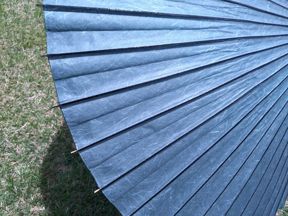 The original Meito parasol is double-layered. The outer layer is a chic navy blue color, and the inner layer is a floral arabesque pattern.