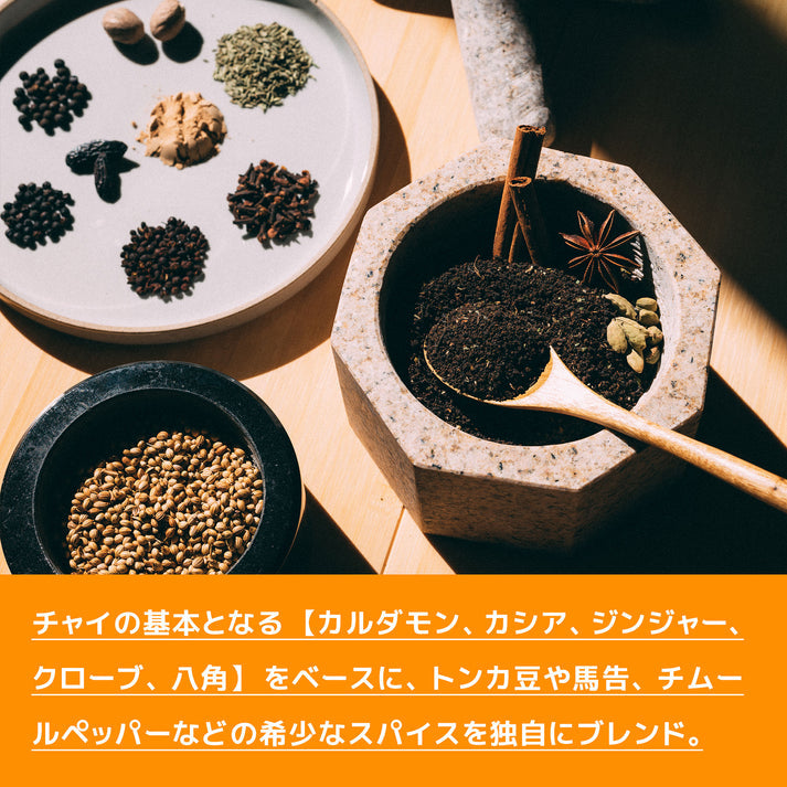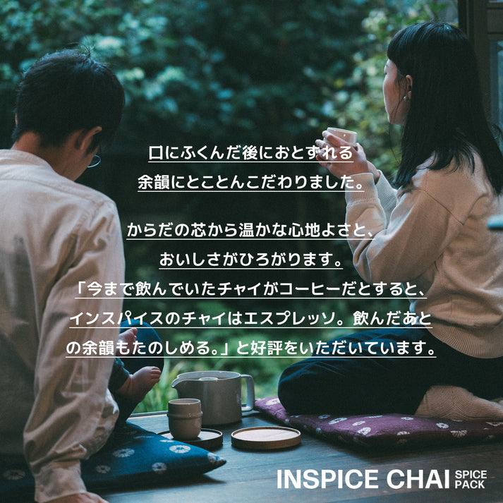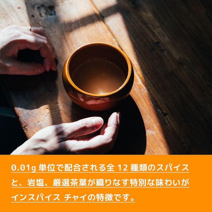 12 kinds of carefully selected spices and tea leaves, including mako, tonka beans, and timur, in one pack. A special flavor that can only be enjoyed with Inspice Chai. Made with luxurious tea leaves from Brooke Bond's Taj Mahal Tea, the gold standard for the best tea in India. To make chai, please prepare your preferred amount of sugar and milk in addition to this product. For various mornings. For various nights. Enjoy the rich time of brewing chai with Inspice Chai.