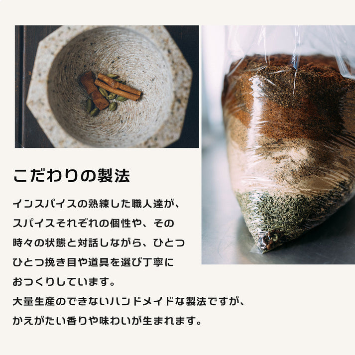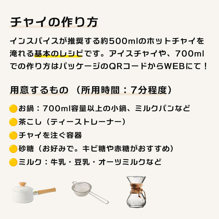 A chai spice pack that makes it easy to brew authentic chai at home. 12 types of carefully selected spices and tea leaves, including mako, tonka beans, and timur, in one pack. A special flavor that can only be tasted with Inspice Chai. Made with luxurious tea leaves from Brooke Bond's Taj Mahal Tea, the gold standard as the best tea in India. To make chai, please prepare your desired amount of sugar and milk in addition to this product. For various mornings. For various nights. Enjoy the rich time of brewing chai with Inspice Chai.