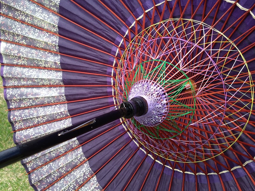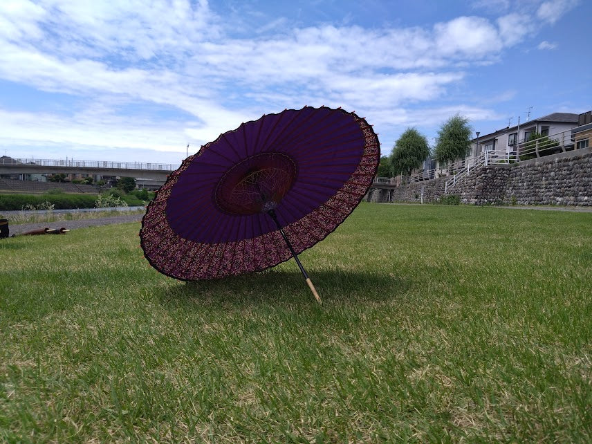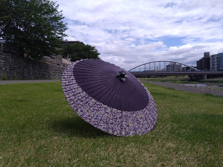 A glossy Japanese umbrella with four or five bones, two-tiered, purple background with cute little flowers.