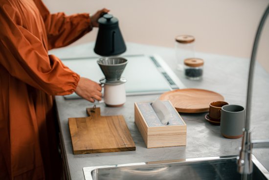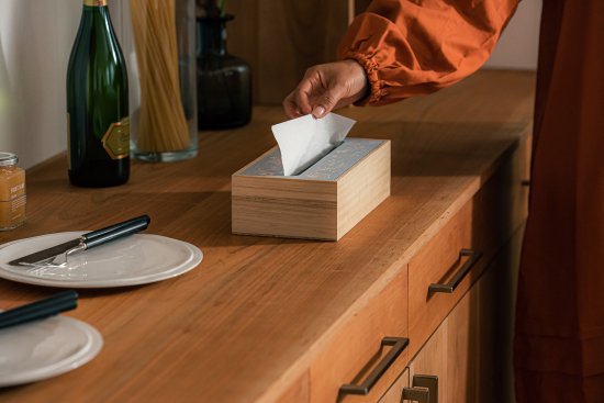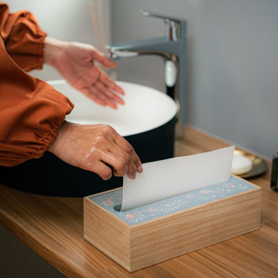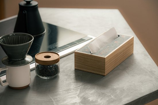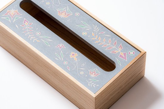 「珪藻土ペーパータオルボックス」は、そんな豊かな自然の恵みと自然美を大切にする加賀友禅が出会うことで誕生しました。水が跳ねても素早く吸水・速乾で清潔です。好みのエッセンシャルオイルを垂らせば、香りを広げるディフューザーとしても使えます。伝統的な加賀友禅の着物にも使われる出世や開運や繁栄などを意味する「藤・菖蒲・七宝・小槌」をモチーフにデザインしました。